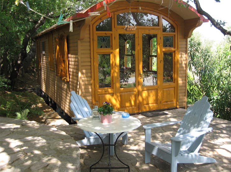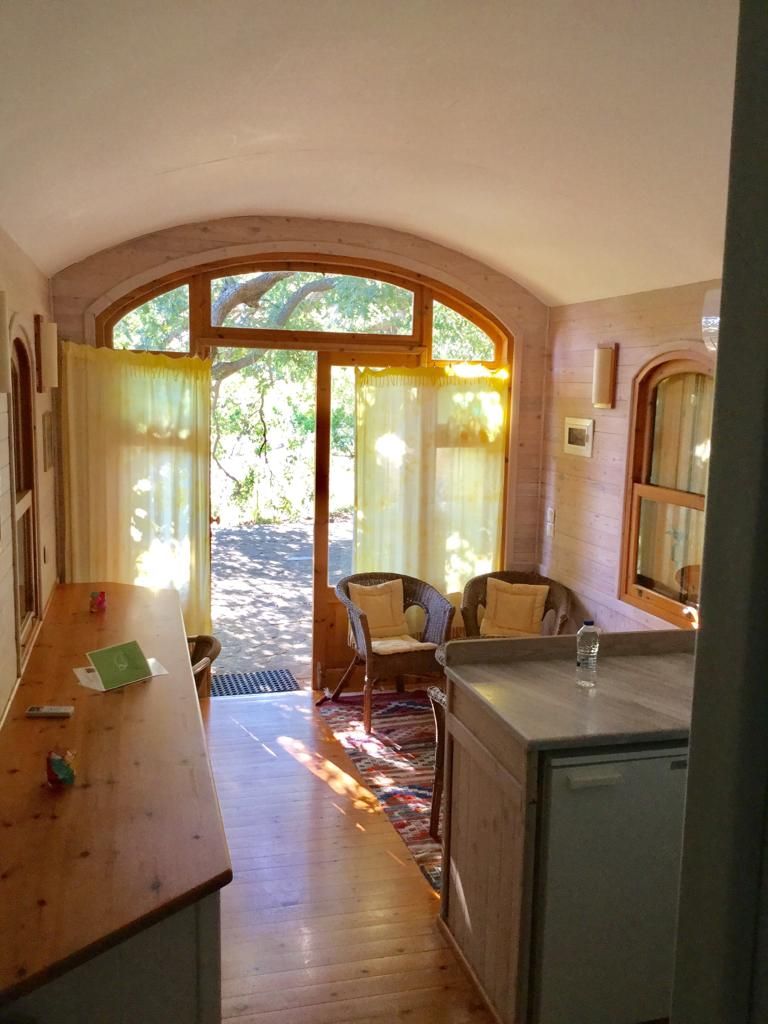 Dette værelse er en hyggelig skurvogn med en halvandenmandsseng, aircondition, lille køkken, eget bad og toilet og egen terrasse. Sælges kun som enkeltværelse, da der kun er én seng.